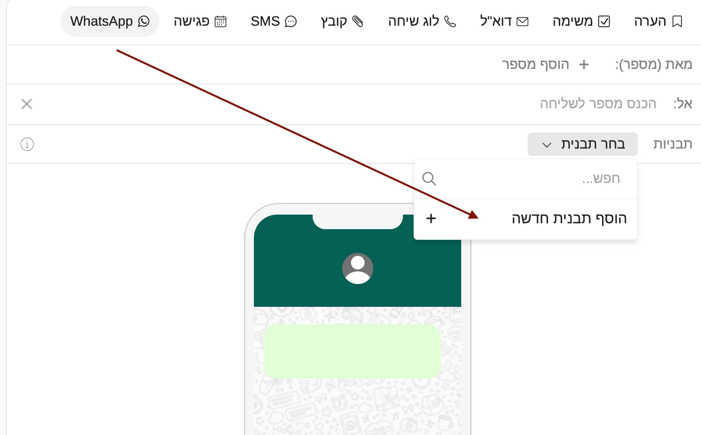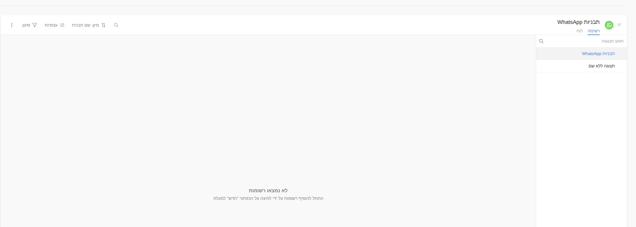 אני מנסה ליצור תבניות הודעה שונות. אני מנסה להבין איך בדיוק משתמשים בממשק ה-WhatsApp בתוך Fireberry, כי כרגע נראה שהמערכת לא מאפשרת לבצע כמעט שום פעולה.